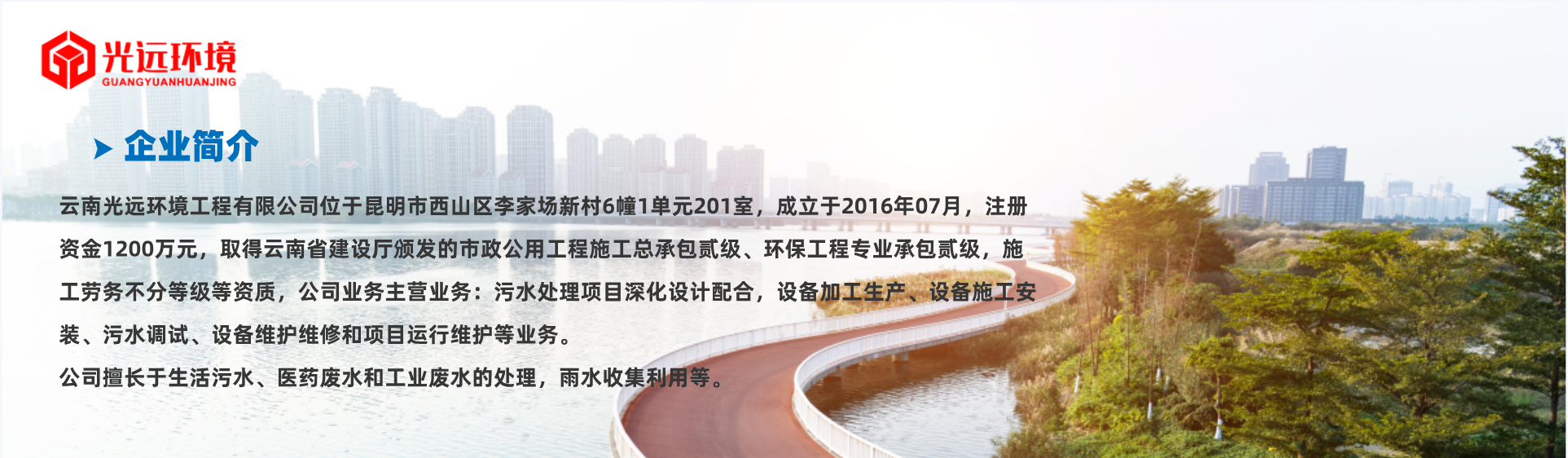 云南光遠(yuǎn)環(huán)境工程有限公司位于昆明市西山區(qū)李家場新村6幢1單元201室,成立于2016年07月,注冊資金1200萬元,取得云南省建設(shè)廳頒發(fā)的市政公用工程施工總承包貳級、環(huán)保工程專業(yè)承包貳級,施工勞務(wù)不分等級等資質(zhì),公司業(yè)務(wù)主營業(yè)務(wù):污水處理項(xiàng)目深化設(shè)計(jì)配合,設(shè)備加工生產(chǎn)、設(shè)備施工安裝、污水調(diào)試、設(shè)備維護(hù)維修和項(xiàng)目運(yùn)行維護(hù)等業(yè)務(wù)。,擁有專業(yè)建技術(shù)工程師5人,建造師3的,項(xiàng)目管理人員若干,累計(jì)完成50多個項(xiàng)目,成為五家500強(qiáng)企業(yè)合作伙伴,為多個客戶解決水污染治理的難題。