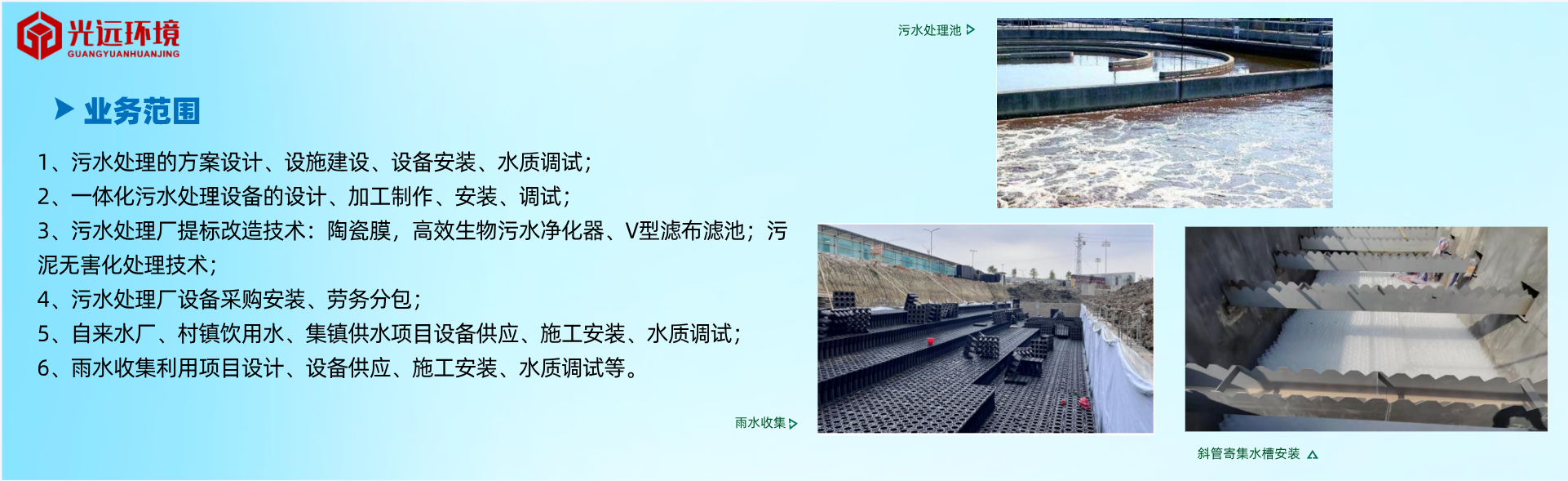 公司致力于污水處理事業(yè)的研究發(fā)展,主要從事:污水處理場、自來水廠、污水處理站、村鎮(zhèn)飲用水、集鎮(zhèn)供水等項(xiàng)目的設(shè)計(jì)、新建、提標(biāo)改造和運(yùn)行維護(hù)及相關(guān)工作。